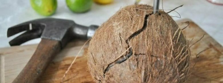 1. Использование молотка. Небольшими ударами молотка по всей поверхности кокоса можно разбить его на две части, после чего мякоть будет легко извлечь.
