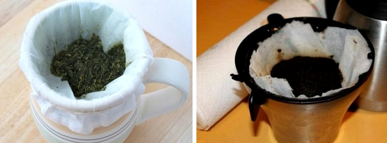 Просто возьмите небольшой кусочек, накройте сверху кружку и процедите чайный напиток. Все листочки останутся на полотенце. Таким же образом можно заварить кофе в кружке, если неожиданно закончились фильтры в кофеварке.