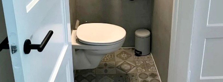 Установите унитаз компактного размера, который займет меньше места и не будет мешать при открытии двери.