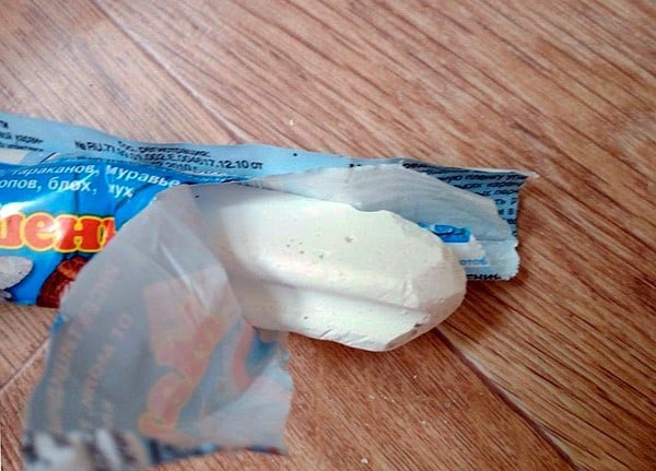 Отрава напоминает обычный белый мел (20 г) в синей упаковке из целлофана. В магазинах можно купить мелок «Машеньку» только в таком виде. 1 штуки хватает, чтобы обработать жилплощадь до 40 м2.