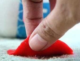 При этом старая засохшая пена неустойчива к обычной воде. На пятно нужно положить мокрую тряпку и оставить ее в таком положении на несколько часов. Ворс впитывает влагу, становится очень скользким, и ее можно удалить даже вручную, аккуратно отслаивая ее от ковра.