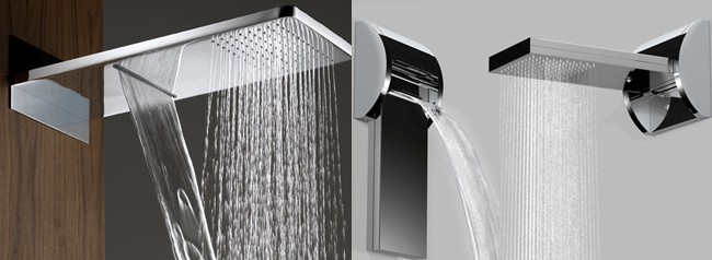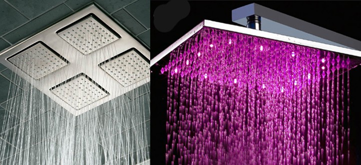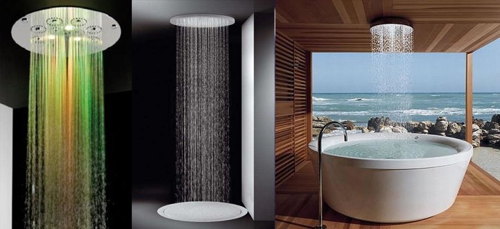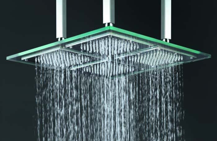 Данный тип относится к потолочным и имеет все характерные функции. Единственное отличие – это их дизайн и материал изготовления: они обладают различными формами и имеют полупрозрачный вид. Стекло является прекрасным материалом для ванной комнаты. При принятии водных процедур создается ощущение, будто вода льется прямо с потолка. Стоимость: