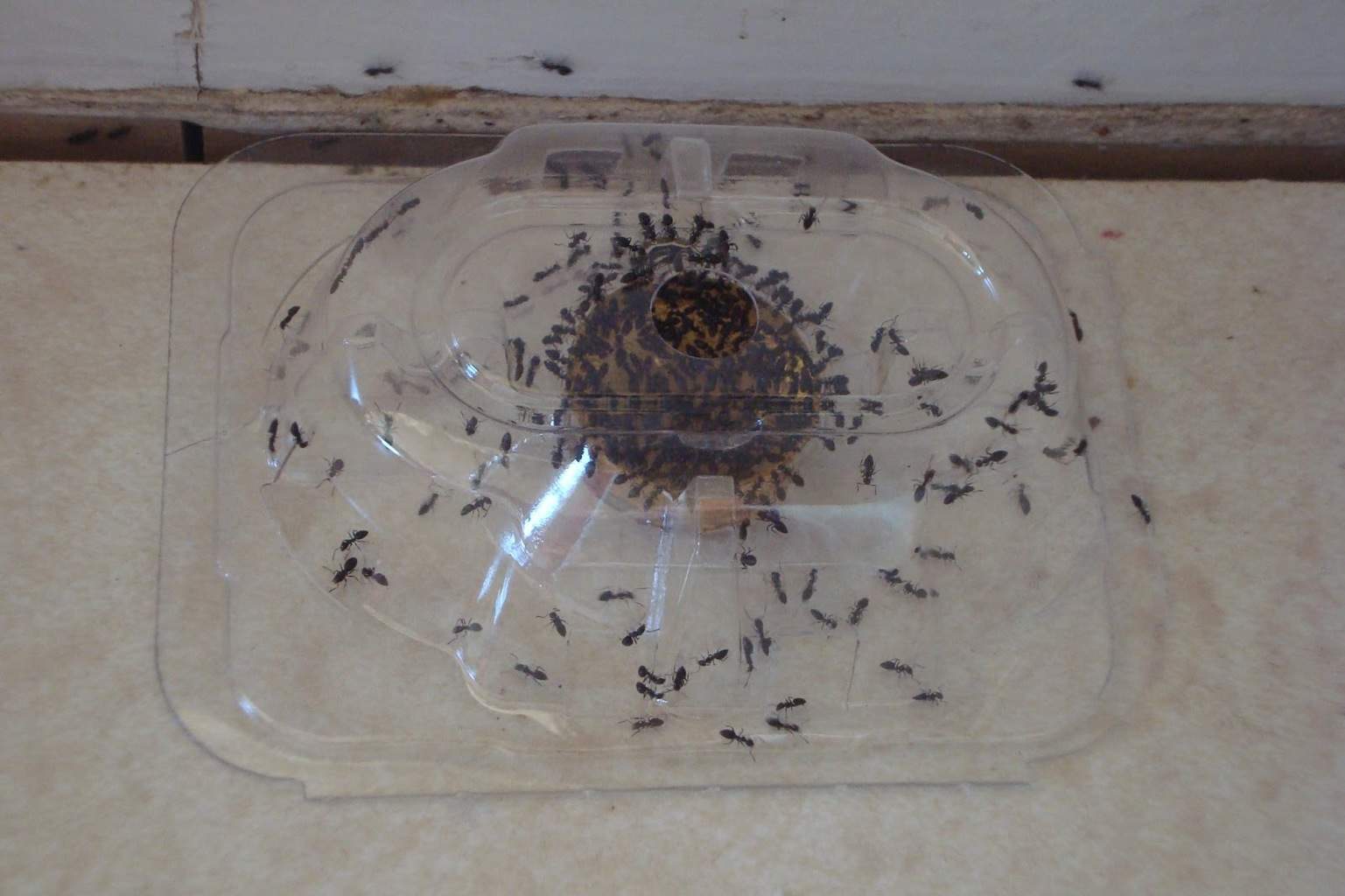 Суть конструкции несложная – муравьи попадают через отверстие в ловушку и просто приклеиваются, не имея возможности выбраться.